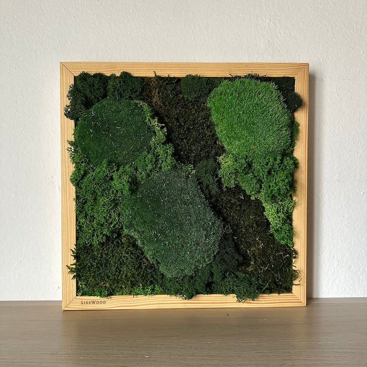 Handmade painting with fluffy tufts of several types of moss.