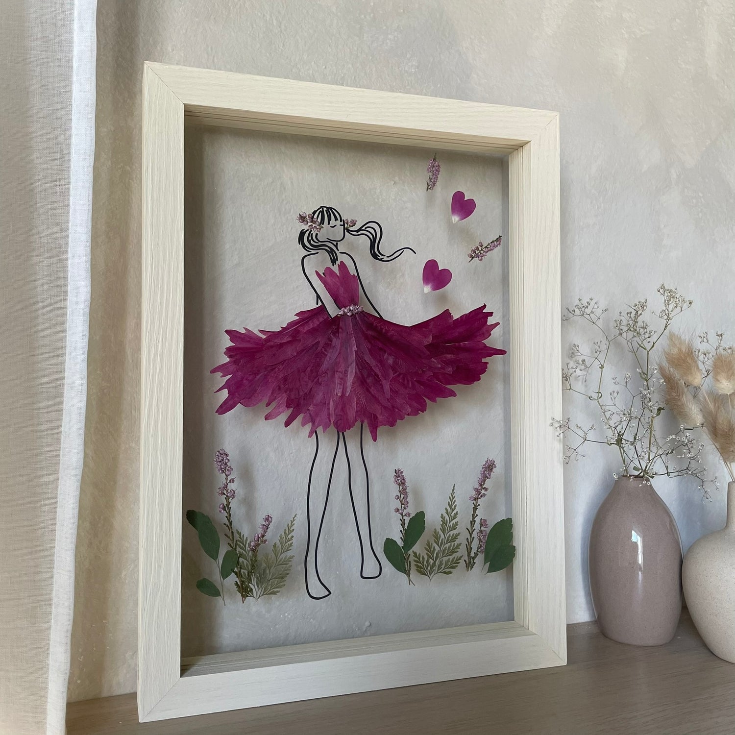 The flowers and plants used are real, hand-picked and gently pressed to preserve their natural structure, softness and color. 🌿 They are then delicately arranged into a unique composition - each painting is original, no two pieces are the same.