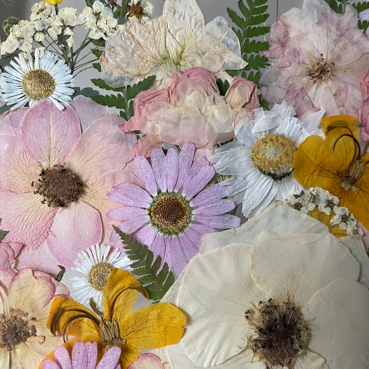 The flowers and plants used are real, hand-picked and gently pressed to preserve their natural structure, softness and color. 🌿 They are then delicately arranged into a unique composition - each painting is original, no two pieces are the same.