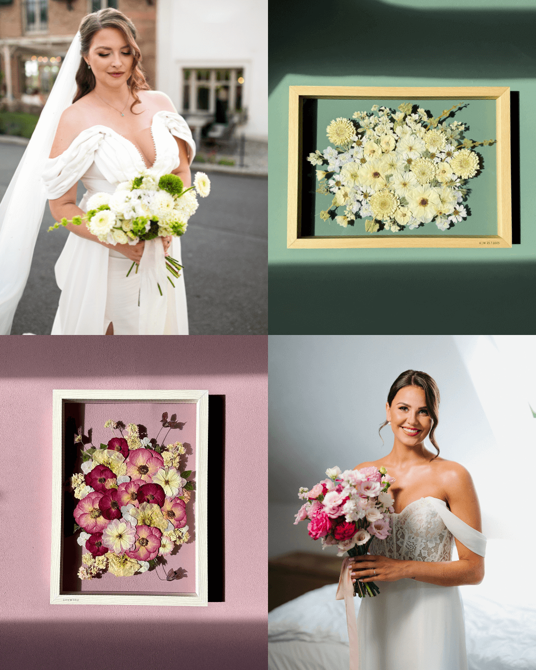 Are you going to a wedding and don't know what to do with a wedding gift? Give our voucher for pressing and framing a wedding bouquet. It is a very original gift that will please every woman and create a beautiful memory of her wedding day.