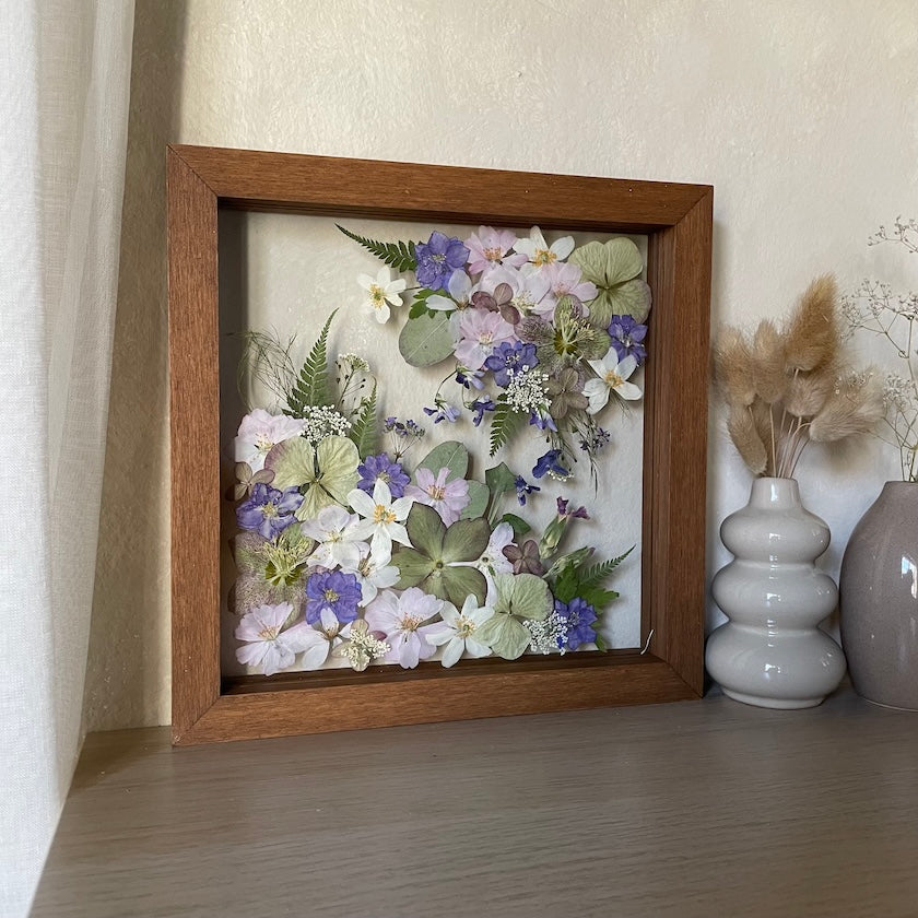 That's exactly what our paintings are. We believe in originality and quality, which is why each of our paintings is an original made from real pressed local flowers framed in handmade solid wooden frames.