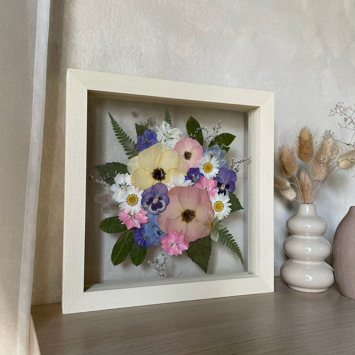 The flowers and plants used are real, hand-picked and gently pressed to preserve their natural structure, softness and color. 🌿 They are then delicately arranged into a unique composition - each painting is original, no two pieces are the same.