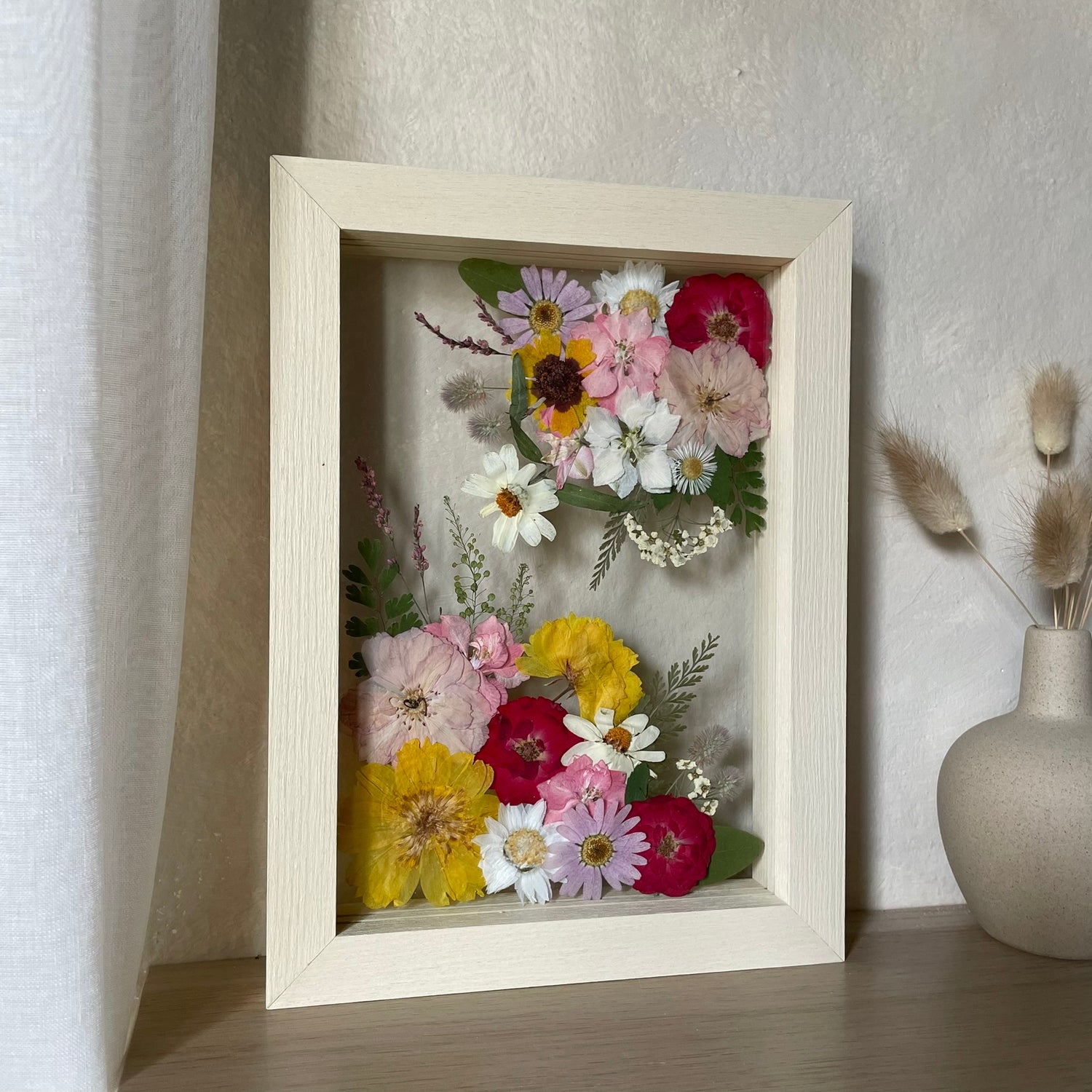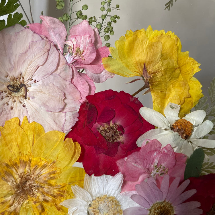 The flowers and plants used are real, hand-picked and gently pressed to preserve their natural structure, softness and color. 🌿 They are then delicately arranged into a unique composition - each painting is original, no two pieces are the same.