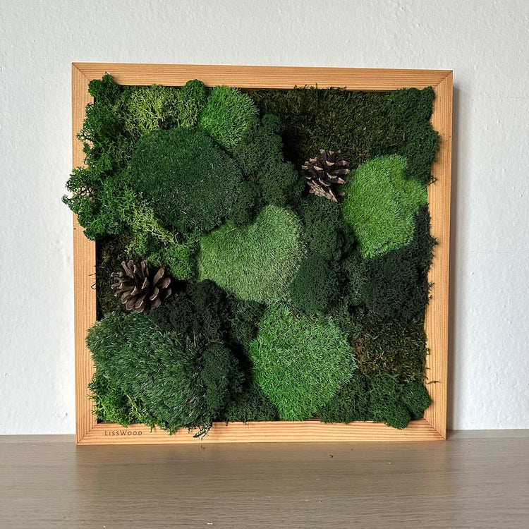 Handmade painting with fluffy tufts of several types of moss.